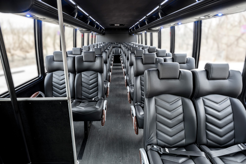- High-back custom black leather-like seating with elite arm rests (37 passenger model only) and seat belts, reclining (except for rear row)